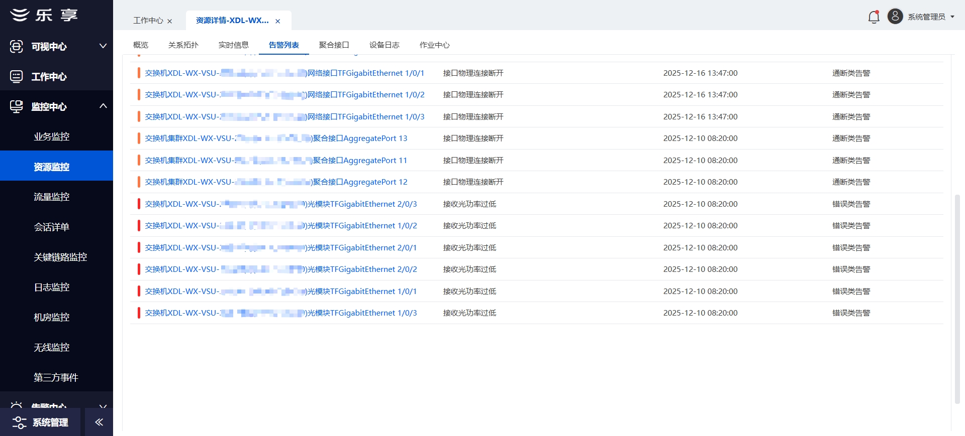 乐享的关键链路检测功能精准破解了这一难题。对于光衰告警等显性问题,团队收到通知后可直接现场清洁接头或更换跳纤,快速解决;对于隐性问题,平台也能通过流量曲线等数据异常及时预警。