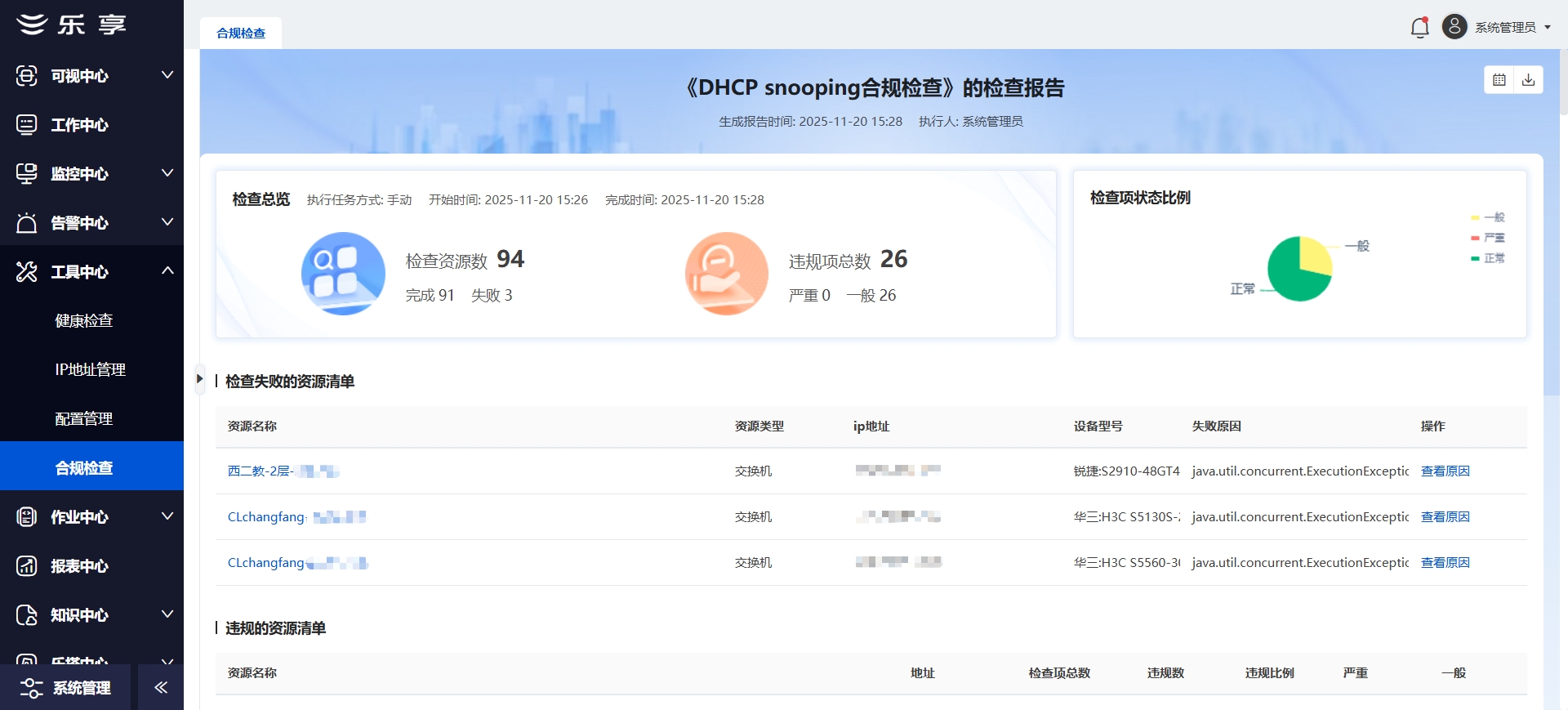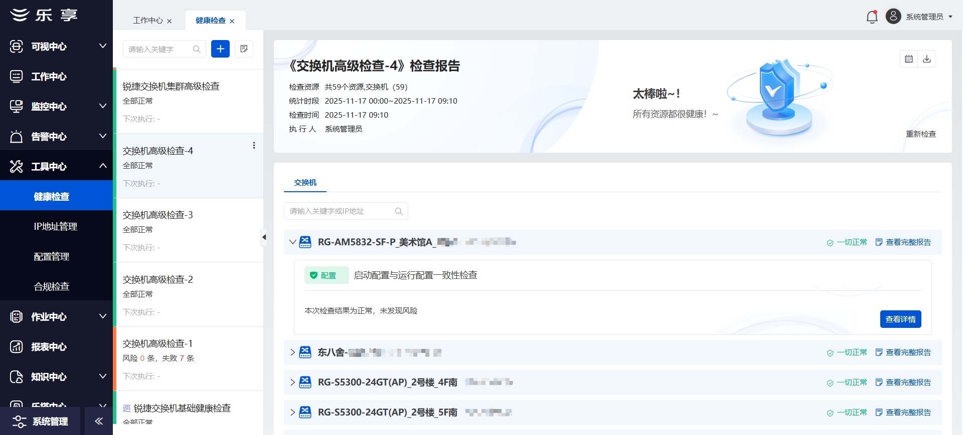 通过乐享平台,学校实现了多品牌、多类型设备的统一纳管,设备资产可视化管理一目了然。关键配置定制化健康检测效率明显提升。平台支持自定义时间自动备份配置,与基准配置对比,历史版本一目了然;设备更换时,也能恢复备份配置到新机。