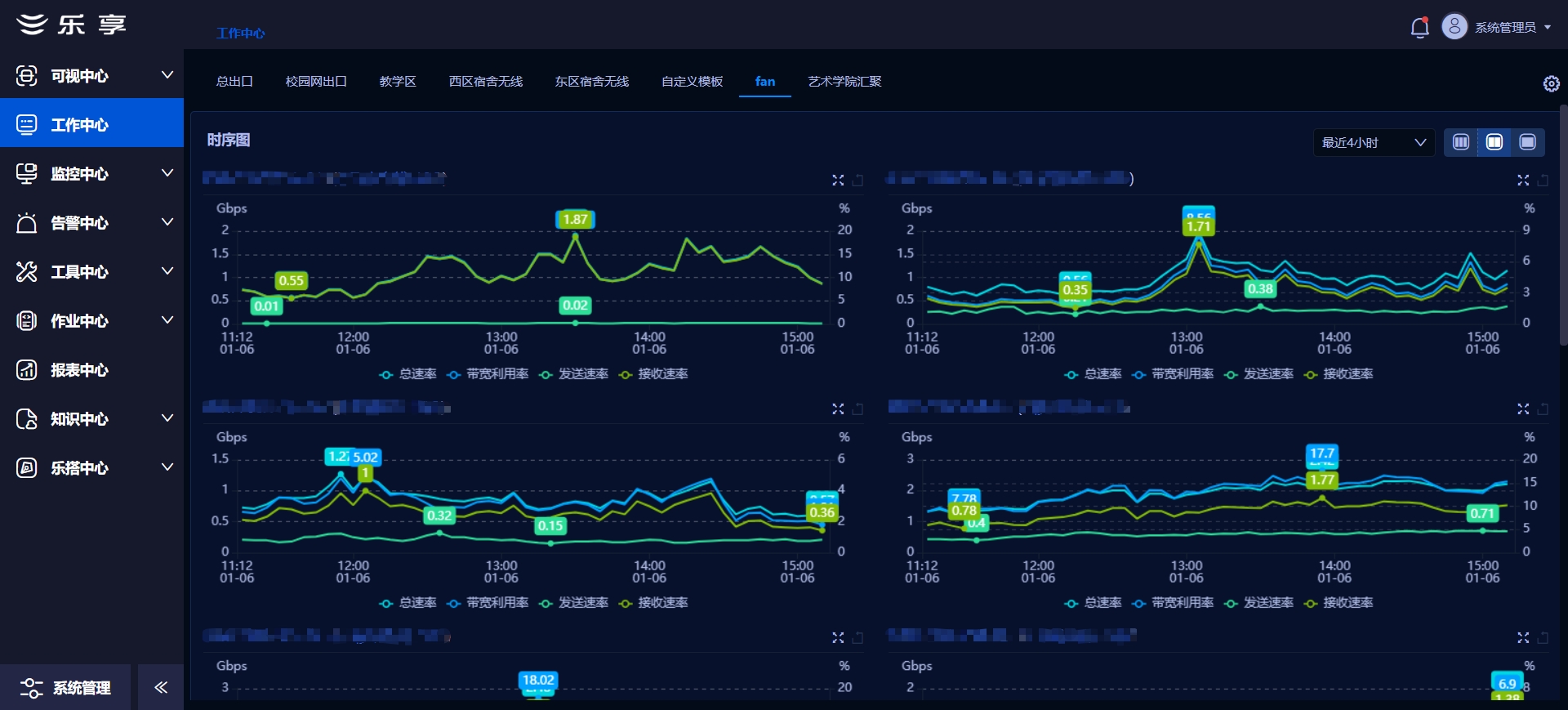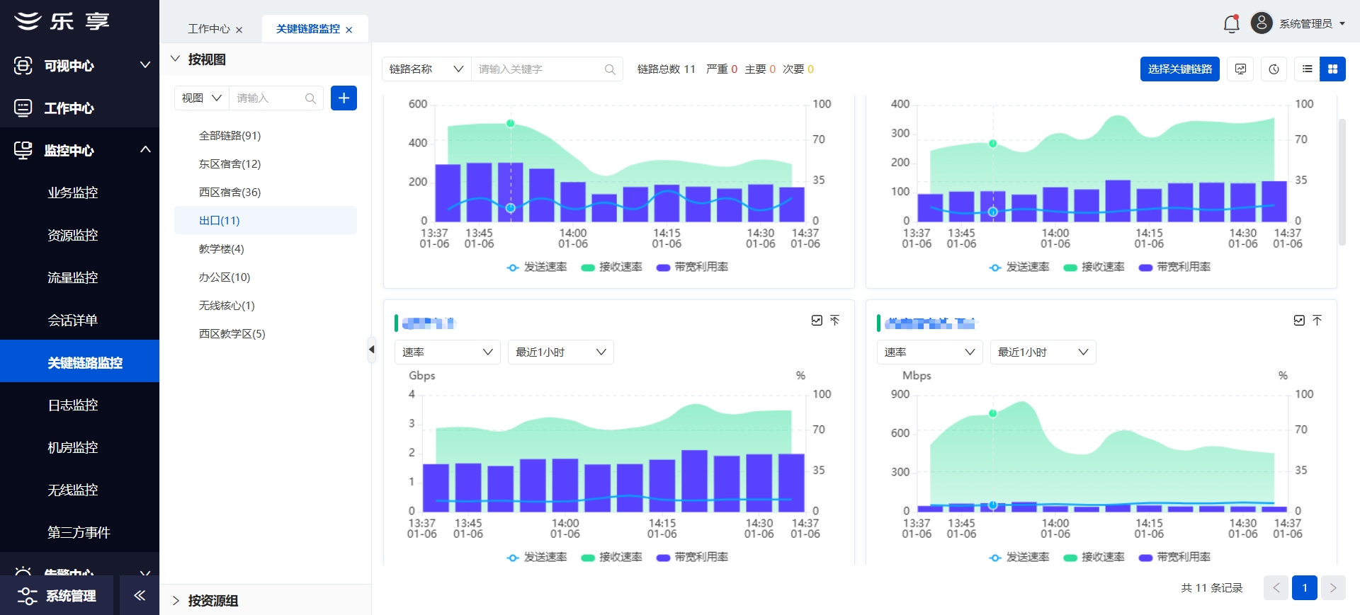 印象深刻的是,一天早晨运维人员通过乐享发现某出口链路流量曲线异常,仅用几分钟便定位到机房内光纤弯折过大的问题,在大量用网之前完成恢复,避免了后续网络卡顿对师生使用造成影响。