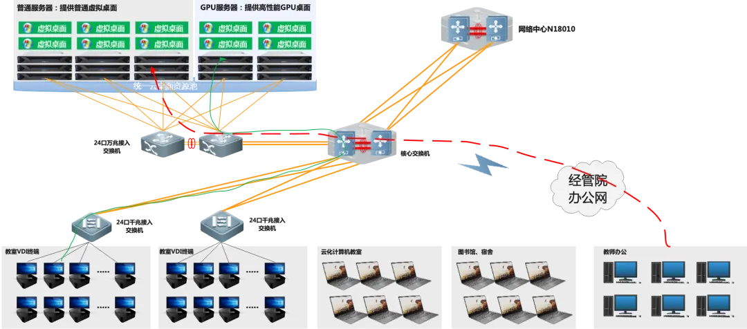 我们梳理了教学实训、科研办公、专业考试、远程实验四大核心场景,明确不同场景的资源需求差异——教学需稳定的标准化环境,科研需高性能计算支撑,学生课后的漫游访问,考试需稳定、安全的系统。因此,我们放弃了针对性的零散方案,决定打造统一资源池,实现“一朵云支撑全场景”。