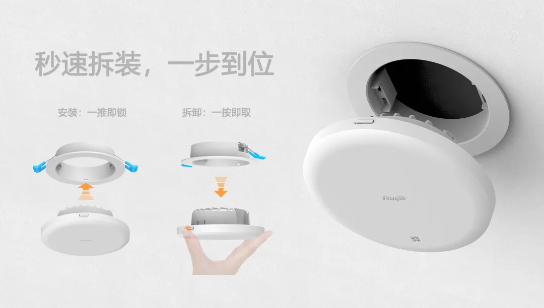 射灯式设计,解决了在酒店、宴会厅等场景中,AP安装为了美观,常会隐藏安装于空调出风口内或藏于吊顶之上,导致AP的信号覆盖效果因遮挡而减弱,影响用户连接使用的问题。