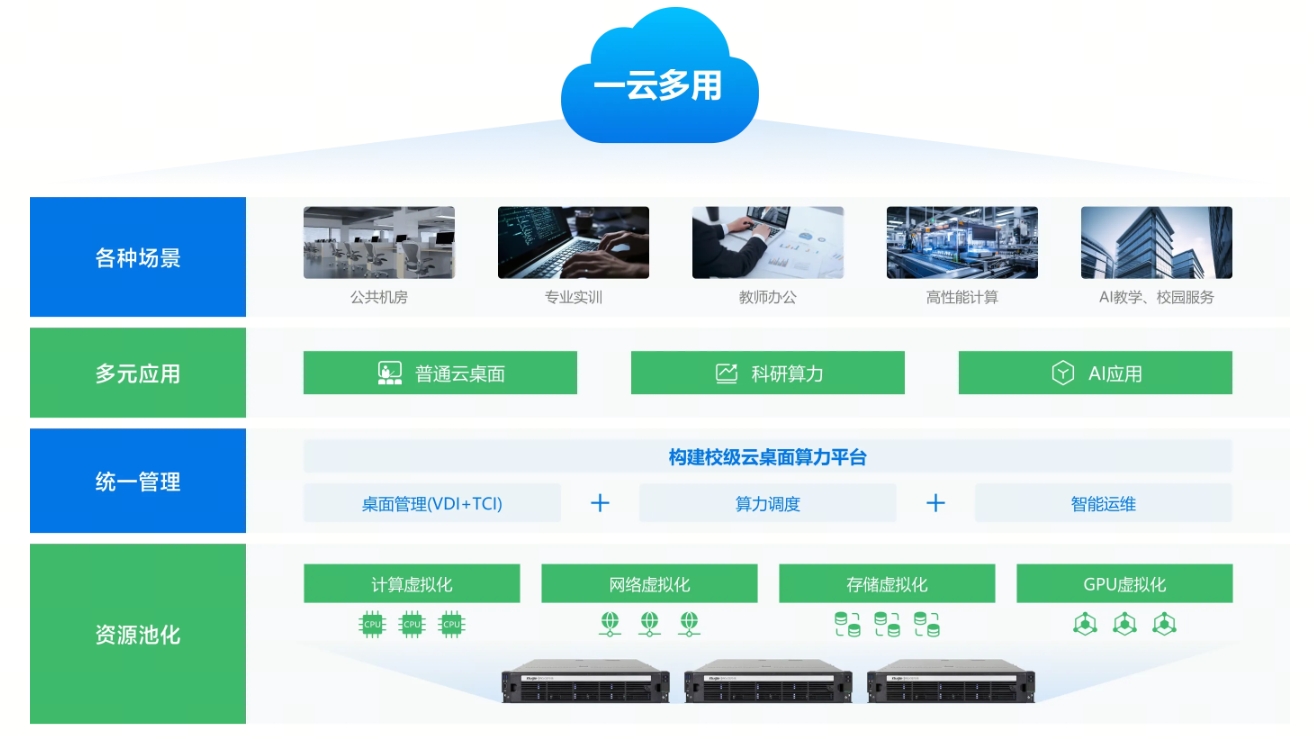 资源池化,让算力“弹性共享”:将 CPU、内存、GPU、存储等硬件资源池化,根据需求动态分配 —— 上课时段给教学桌面分配算力,夜间、假期则将闲置资源调度给科研计算类项目,实现 “分时复用、按需供给”。