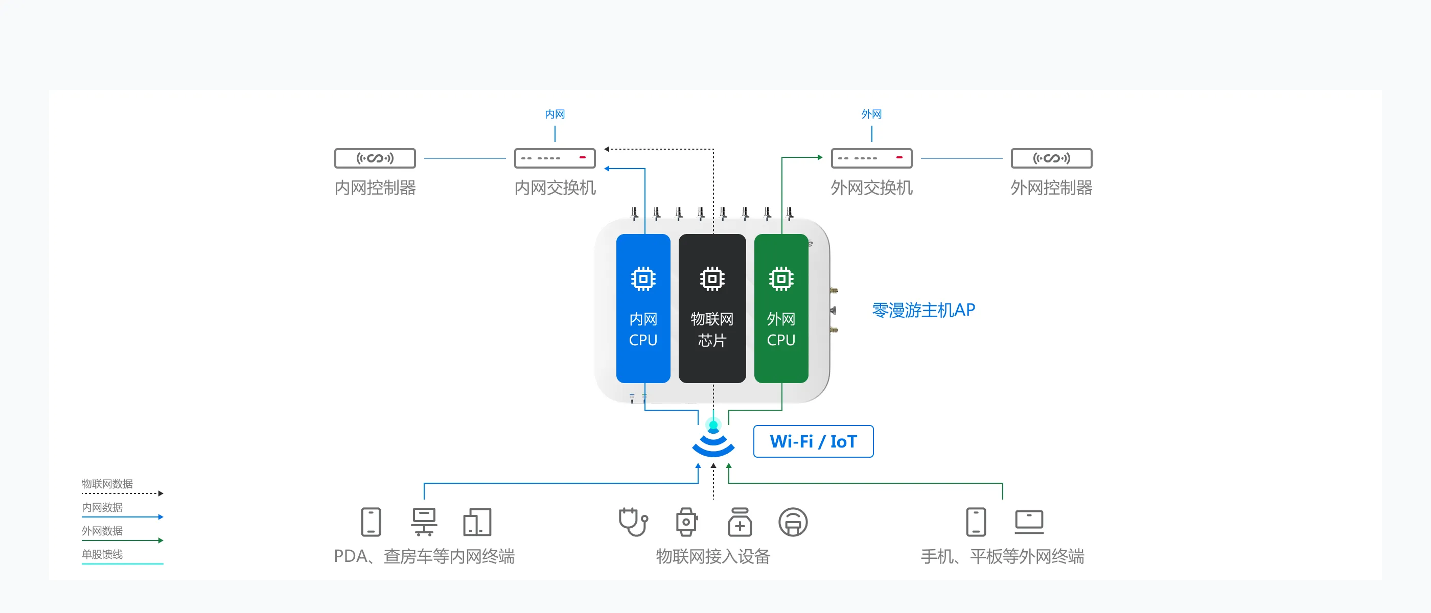 医疗网络需要满足“多网并存、安全隔离”的需求:内网承载HIS、PACS等核心业务系统,外网服务患者及访客访问,物联网则连接输液监控、资产定位等智能设备。传统方案需部署多套独立网络,导致布线繁复、成本叠加、管理复杂。