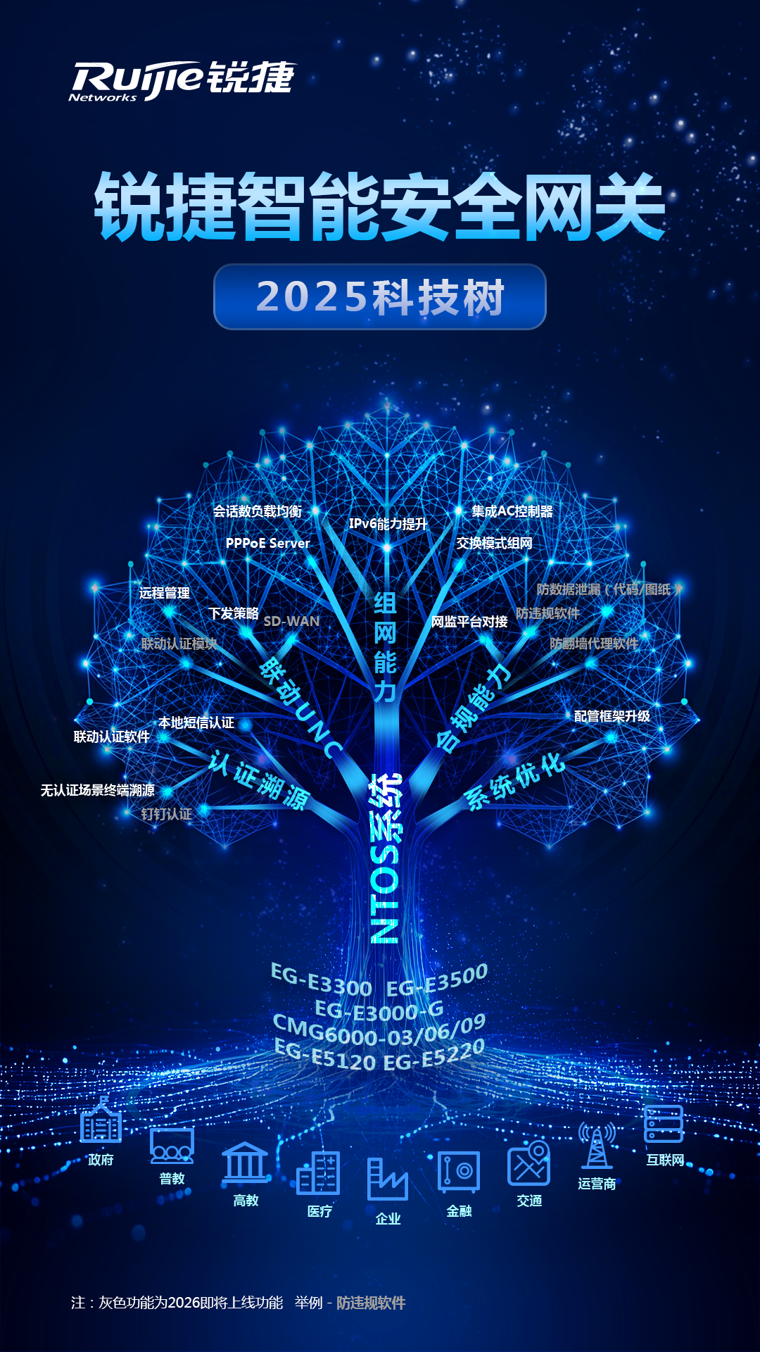 在数字化转型日益深化的今天,网络作为业务承载的基石,其安全性、合规性及运营效率已成为各组织的核心诉求。锐捷安全智能网关,作为一款集网络控制、行为审计、安全防护于一体的综合型产品,2025年正通过其不断演进的技术能力,为客户提供从实名认证、风险溯源,到统一管理、灵活组网,再到全面合规保障的一站式解决方案。致力于将分散的网络、安全与管理功能深度集成,帮助用户以更简单、更经济的方式,构建既能满足严格监管要求,又可以支撑业务高效运行的现代化网络环境。