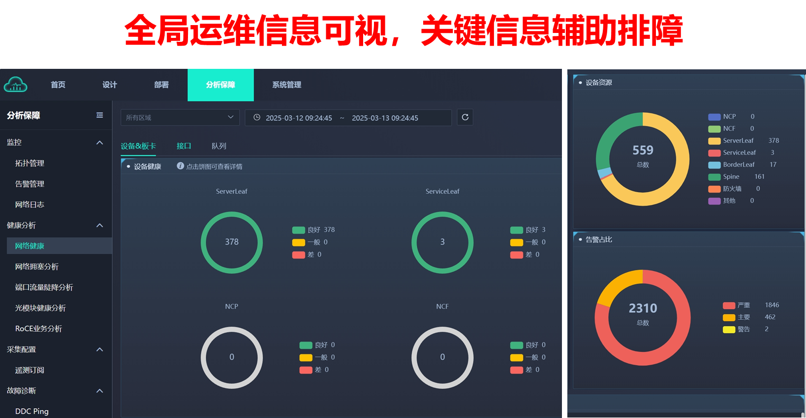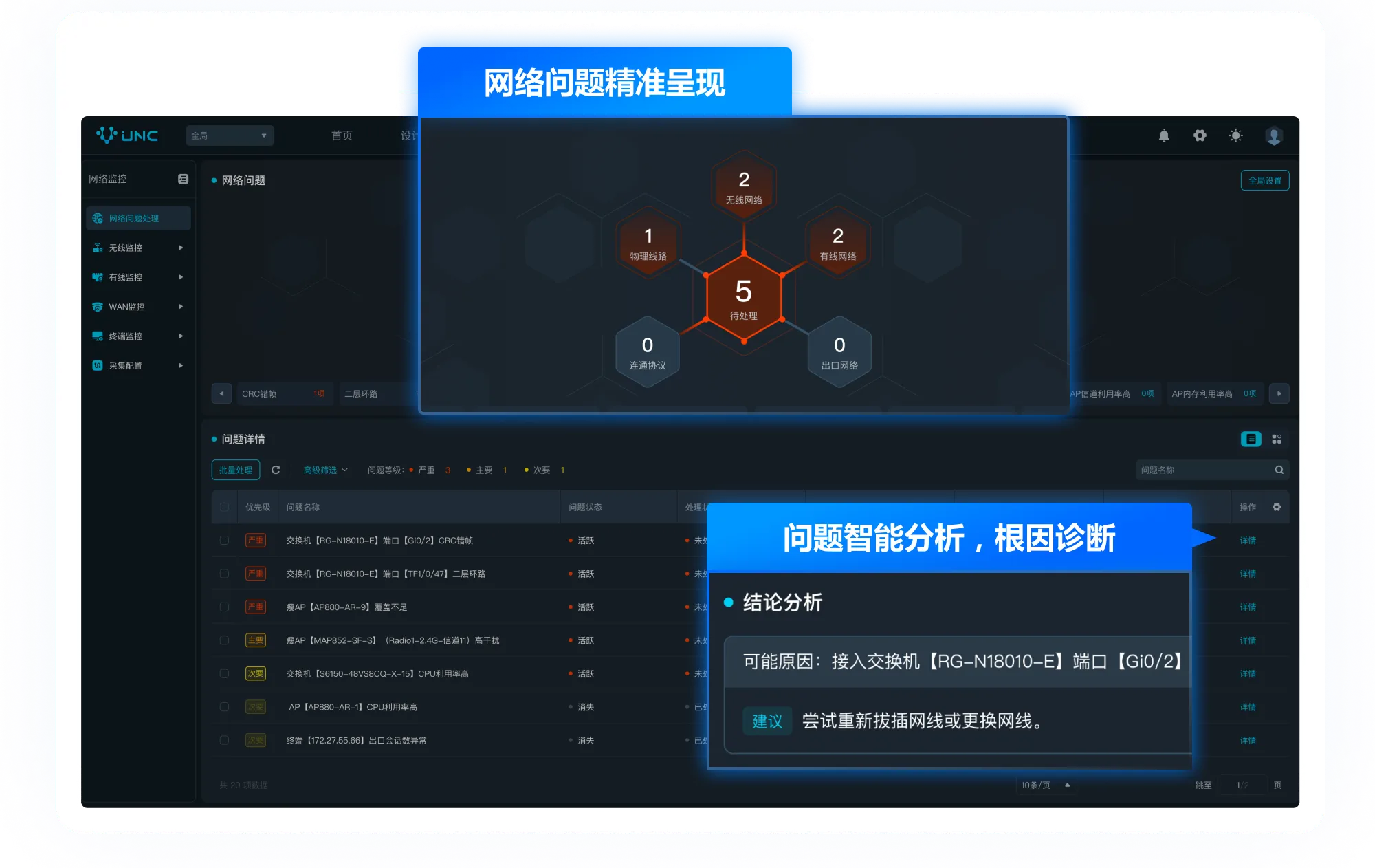 分钟级故障自愈:接入状态、网络状态和网络协议等常见问题分析,提供故障定位、根因分析和修复建议,根因定位时间从小时级缩短至分钟级。