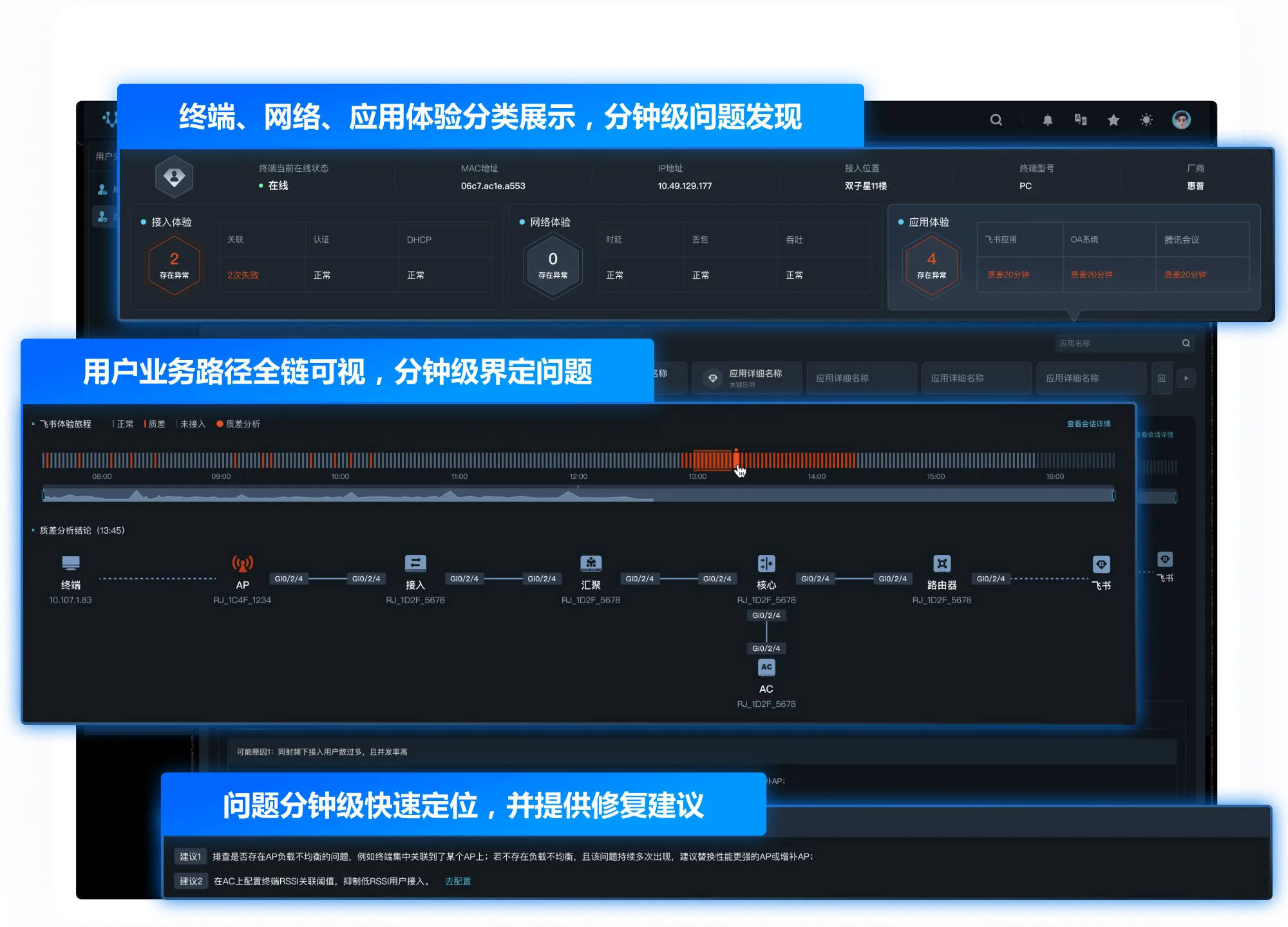 · 无线粘滞,音视频会议突然掉线,严重影响工作效率,到底是网络问题?终端问题?还是应用问题?责任不清,问题难追,缺乏一套智能化的运维工具......