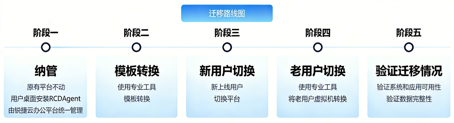 平滑迁移:提供成熟的五阶段迁移路径:纳管 → 模板转换 → 新用户切换 → 老用户迁移 → 验证,助力客户实现“无感切换、体验不降、成本可控”的迁移设计。