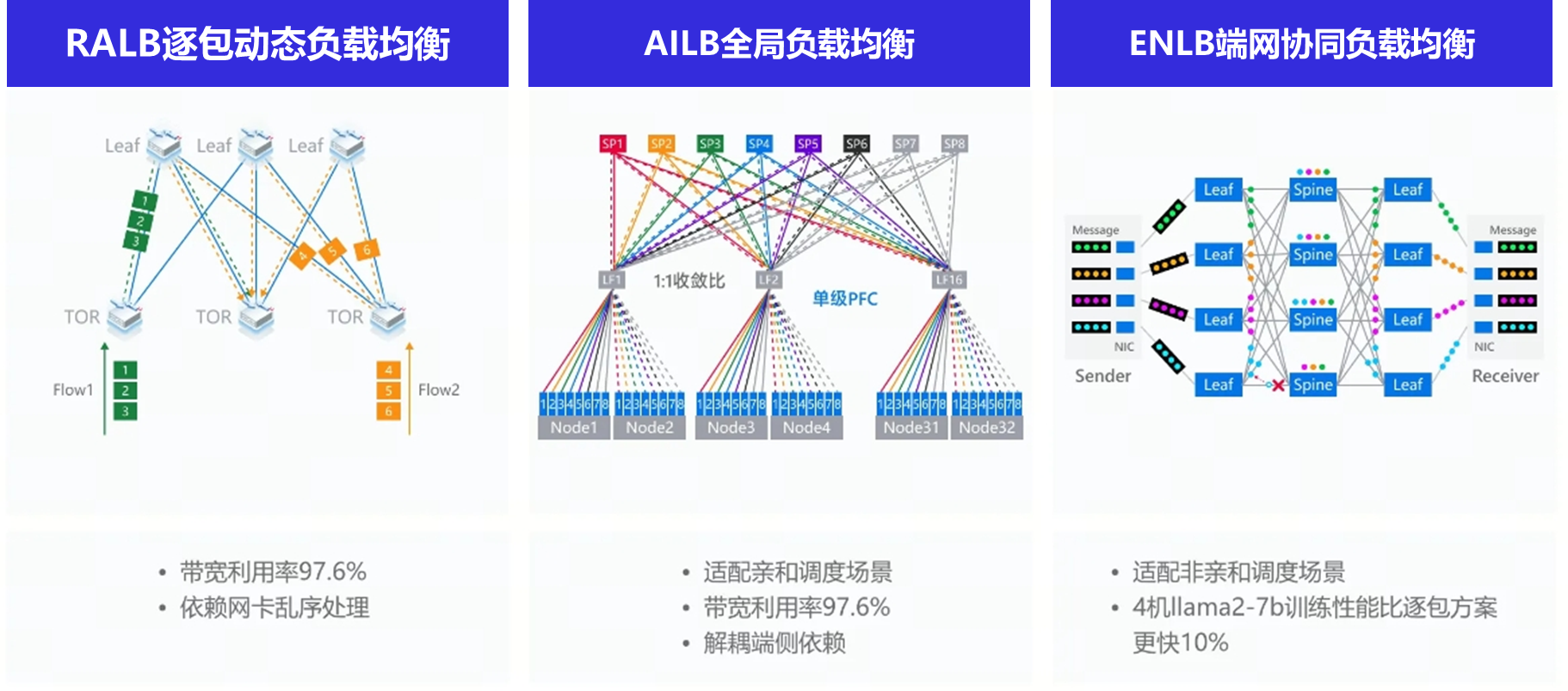高性能无损网络:200G/400G高速互联,采用RALB/AILB/ENLB等智能负载均衡算法,带宽利用率高达97%,保障AI训练与推理任务流畅运行。