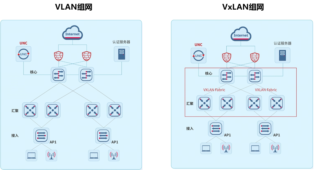 业务随身行:VLAN和VxLAN两种组网模型,均可实现基于用户组的安全策略,位置变化权限不变。