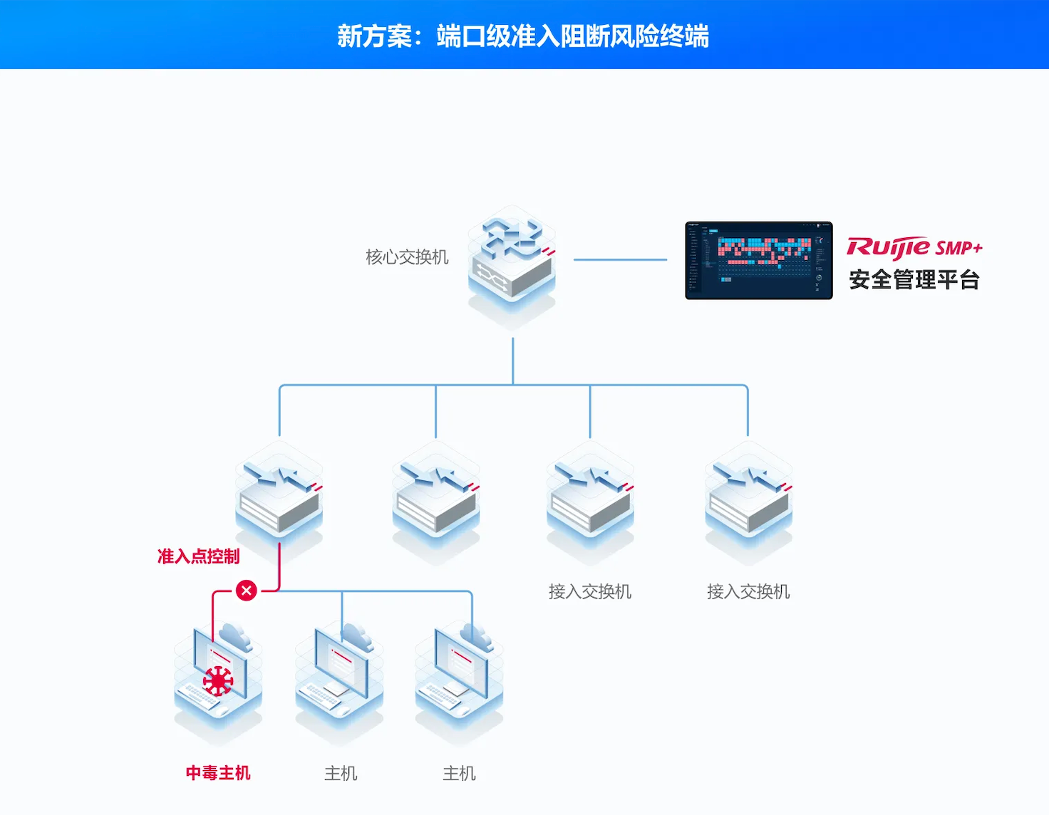 提问:终端入网的准入和安全问题解决了,正常使用就好了,还有必要去管理它么?锐捷观点:终端安全问题不容忽视。随着内网终端类型增多,安全事件频发,虽然很多医院部署了安全态势感知等方案监测和管理终端侧的安全行为。但这些方案往往只能定位到终端IP地址,无法快速精准定位到终端的具体物理位置,导致安全事件处理周期长,投入成本大。