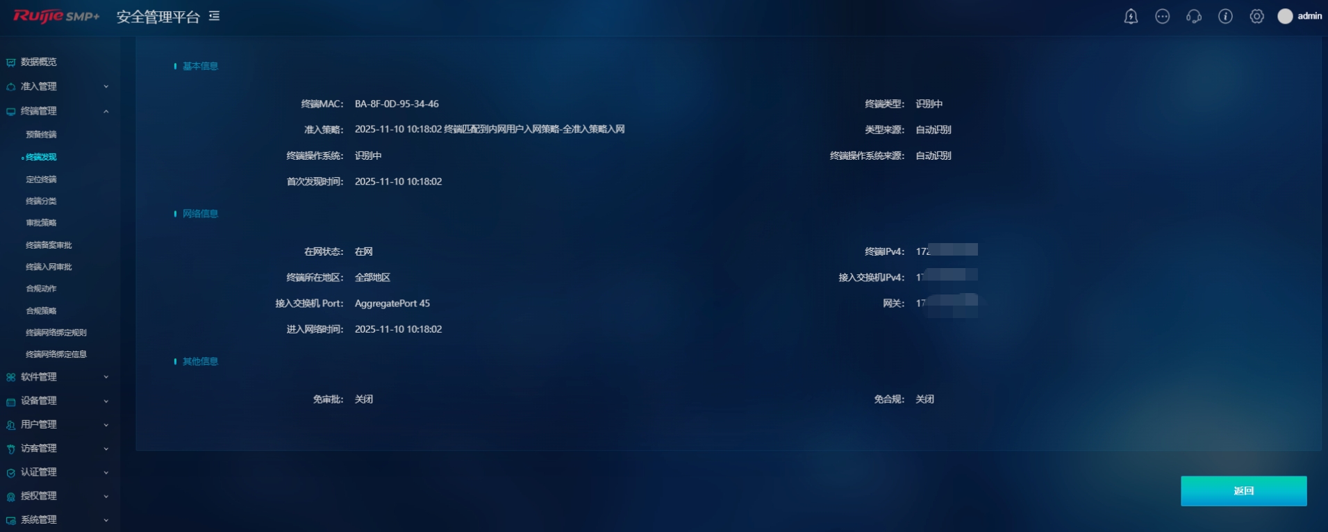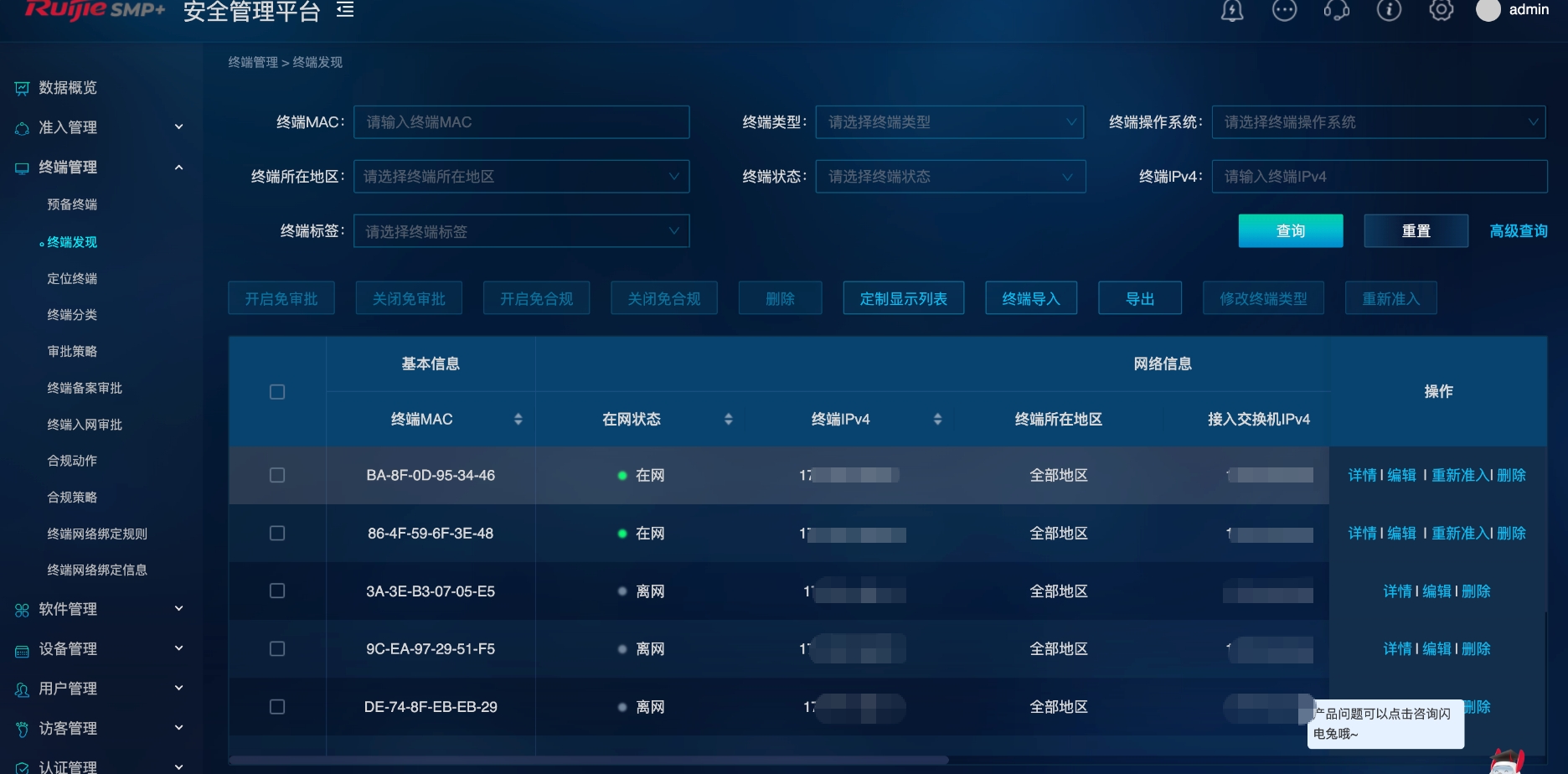 比如能实现全类终端安全审批,端口级准入入网。以往可交互终端与哑终端的认证割裂,需要2个平台分开管理,效率低下。特别是哑终端MAC地址收集工作量大,且存在仿冒风险。如今内网可交互终端、哑终端可在同一平台进行上线入网审批,实现无客户端统一运维管控,无需割裂管理,保证运维数据同步。