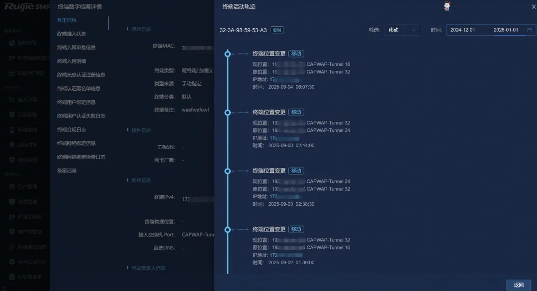 终端在网期间,定位与跟踪其动态至关重要,引进锐捷SMP+准入系统后,管理人员可以随时在管理平台查看终端位置变更的精细化痕迹跟踪记录。