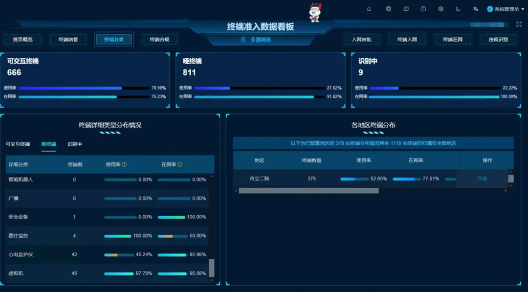 枣庄市立第二医院(简称枣庄市立二院),作为山东省医养结合示范单位,拥有多个院区,所有院区各类终端累积1000余台。医院此前陆续使用了一些准入系统和桌管方案,实现了桌管与准入的一体化,但随着无线化改造的推进,大量哑终端(如监护仪、血糖仪等)接入网络,原有管理系统难以满足需求。实现对全院各类终端设备的精准识别、统一管控与智能运维,成为医院终端管理的建设目标。