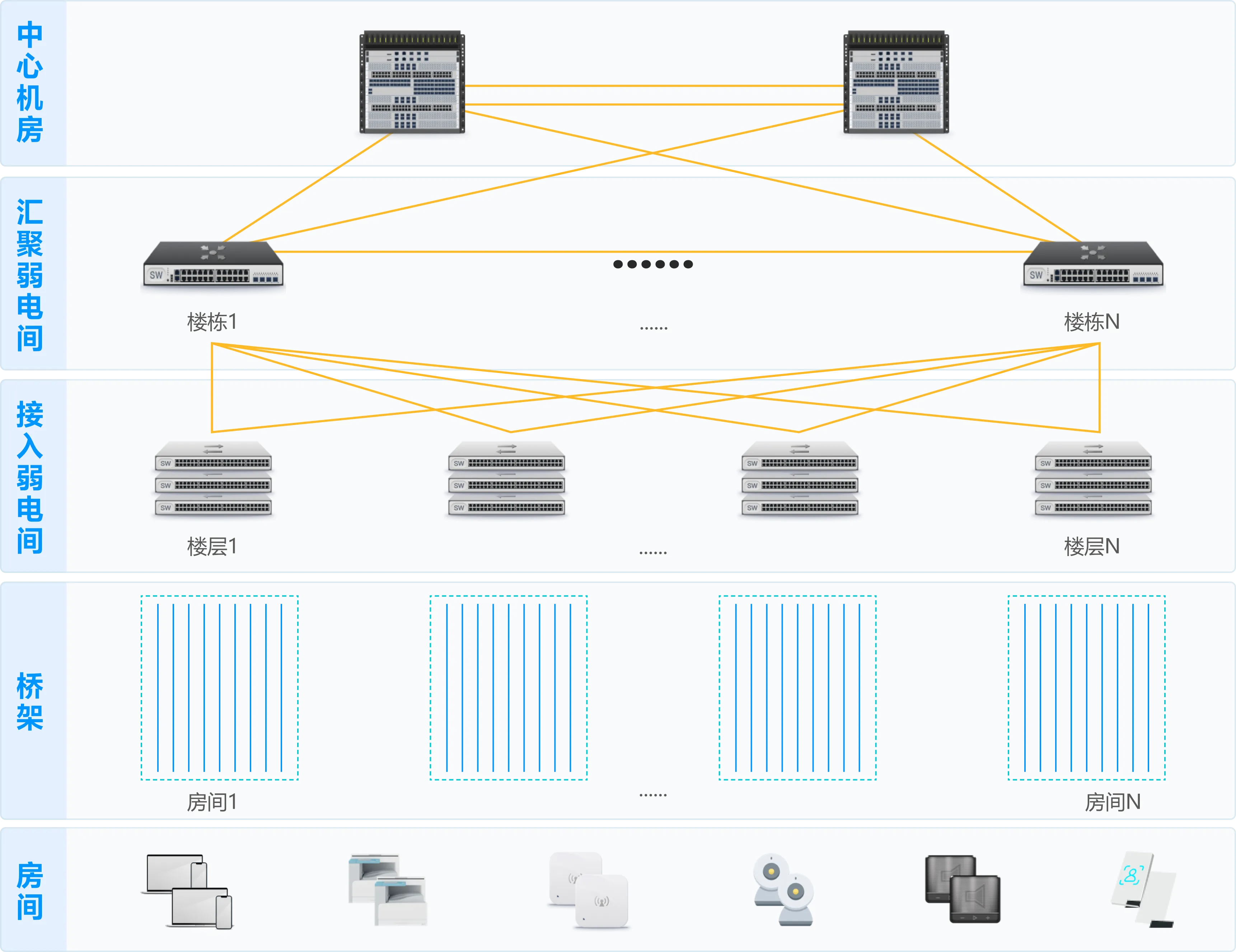 汇聚层设备激增,布线缠绕如 “毛细血管”,弱电间设备密集,管理难度与故障风险同步飙升;