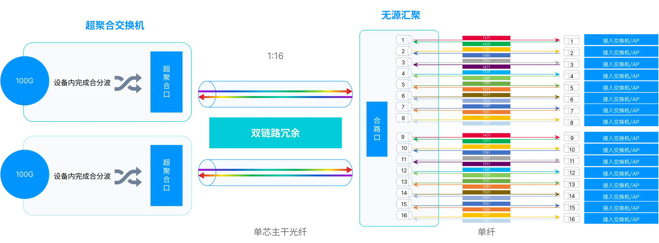 以太彩光网络是将波分复用(WDM)技术深度融入以太网,通过不同波长光信号在同一根光纤并行传输,构建“核心-接入”两层极简架构的全光园区解决方案。