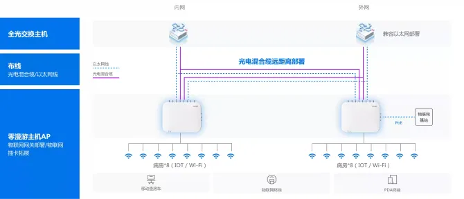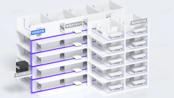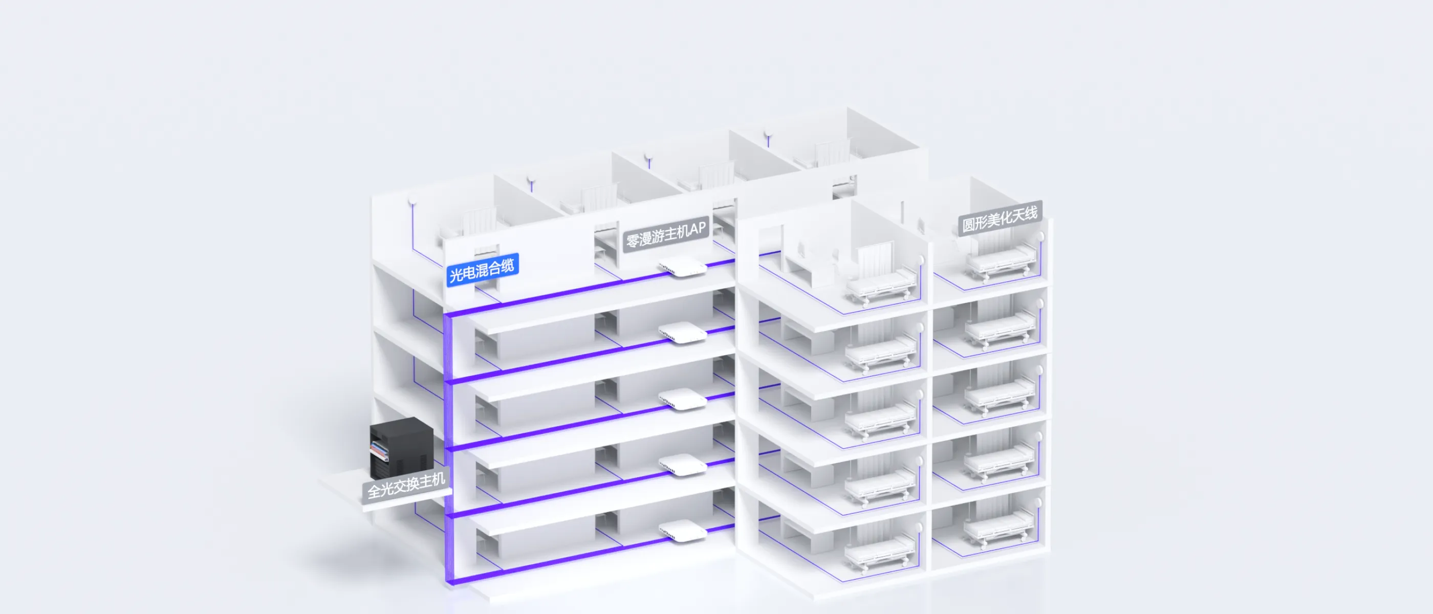 面向病房、门诊、科室等医疗场景,打造医疗新一代全院零漫游解决方案。延续医院三网隔离网络架构的”一机三网“建网思路,通过零漫游主机+天线入室设计,高效建设内网、外网和物联网,结合零漫游技术,搭配超长光电混合缆,实现全院移动零漫游、业务拓展全适配、网络运维可视化。大大提升医疗服务效率和质量,助力智慧医院网络建设