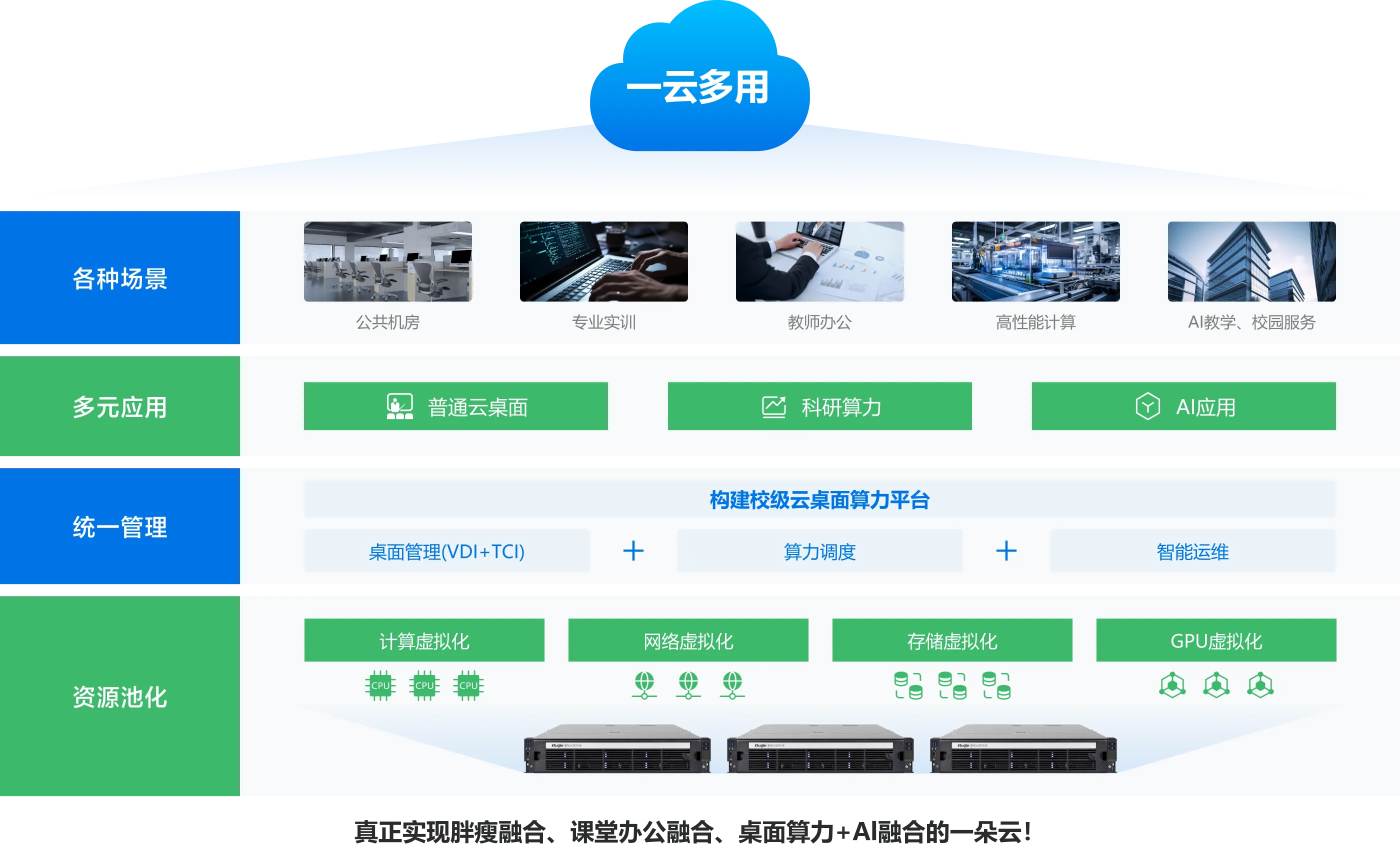 帮助学校建设统一的云桌面算力资源池,同步满足学校对学生算力资源服务、科研计算、在线实训等增值使用需求,真正做到一云多用、一份投资多种用途,满足学校当前多业务使用需求和未来业务发展需要。