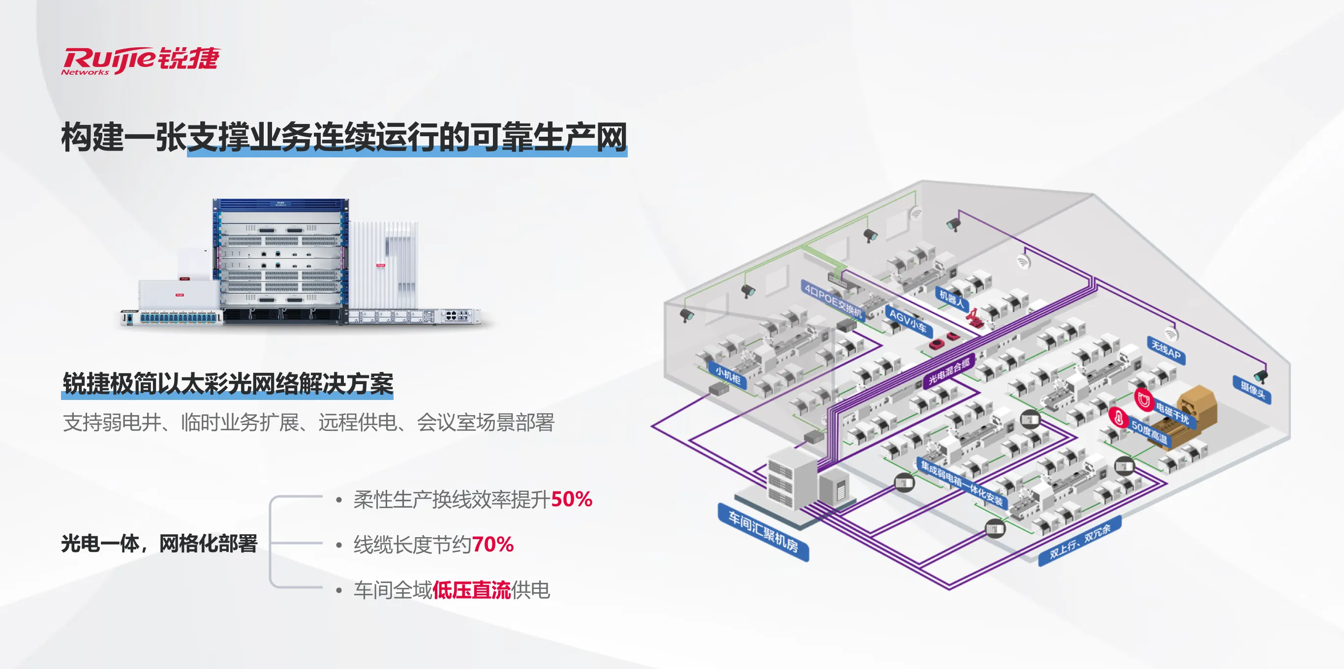 锐捷极简以太彩光网络解决方案面向教育、医疗、办公、智能制造等企业级园区应用场景,采用彩光技术结合光纤入室,有效降低中心机房到各楼栋之间的布线成本,确保带宽独享的基础上,实现弱电间无源,免运维,接入层集中供电,为各行业用户提供一张高效、稳定、简运维且极具前瞻性的全光网络。