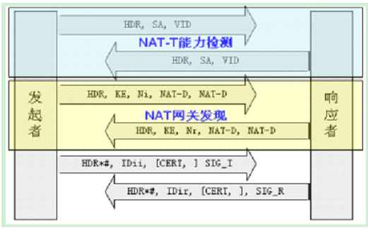 功能是检测通信中是否存在NAT设备和对方是否支持NAT-T。NAT-T能力检测是发生在IKE协商的第一阶段。且在第一阶段的1,2两个消息报文中完成的,通过在消息保证中加入一个vendor ID的载荷,在RFC3947中定义,该值通过hash算法后为十六进制数字:vendor_id=0x4a 0x13 0x1c 0x81 0x7 0x3 0x58 0x45 0x5c 0x57 0x28 0xf2 0xe 0x95 0x45 0x2f,该值在第一,二个报文中都是一致的,用于检测对端是否支持NAT-T。当收到的IKE报文中携带该值,说明对端设备支持NAT-T。