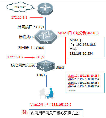 如上图拓扑中的“图2”,在核心交换机拿出一个端口出来连接EG的MGMT口,并把该端口划分到某个vlan(比如上图中的VLan 10),我们MGMT当做一个普通PC的网口,配置IP地址和网关地址。核心交换机的配置如下: