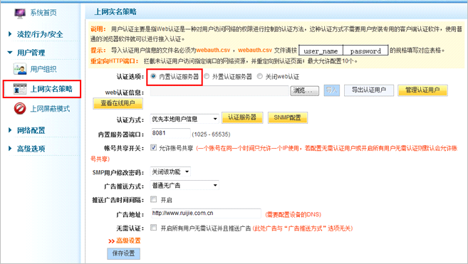 1、在用户管理---上网实名制策略---内置认证服务器,开启web认证功能