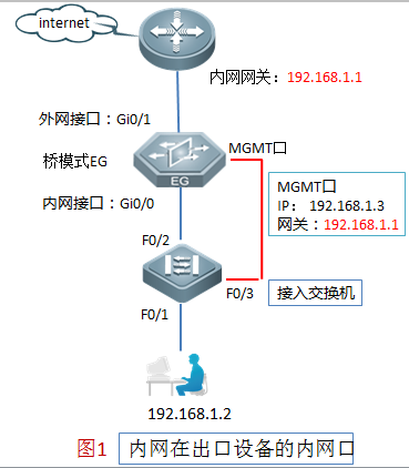 以上拓扑中,针对客户的内网分为不同的网络场景,在图1的场景中,无需在接入层交换上做相关配置;如果客户内网分为多个网段,对应多个vlan,那么需要在内网核心交换机上做相关的配置,因为桥模式下的Mgmt口不仅是用来管理设备使用,当开启了web认证(即上网实名策略)后,Mgmt 口也被用来推送认证窗口。所以Mgmt口要配置网关地址。