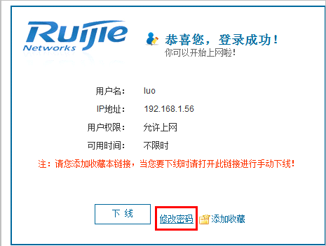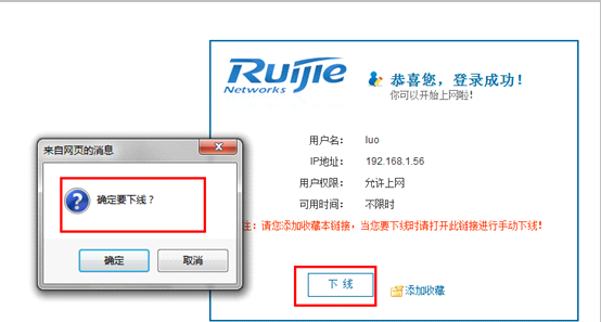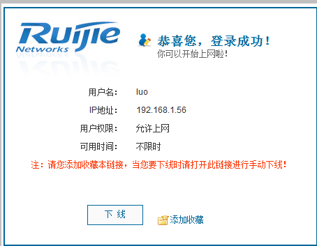 认证成功后,用户需要点击“添加收藏”,把web认证界面添加到浏览器收藏夹中。用户要下线时,从浏览器收藏夹中点击该页面,点击“下线”。