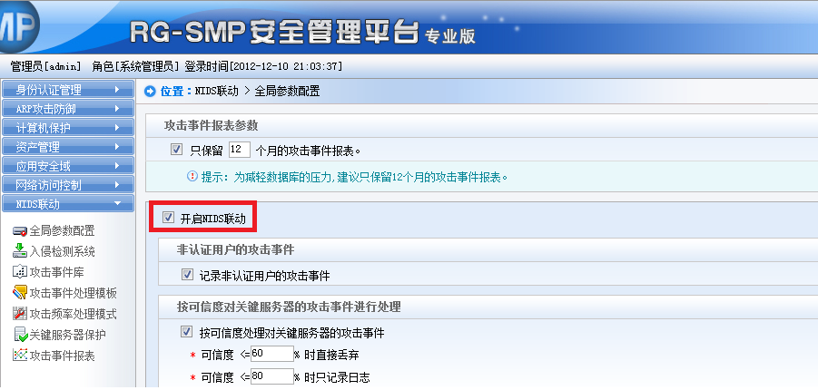 1. 在SMP管理界面中,依次打开“NIDS联动”-“全局参数配置”,在全局参数配置中勾选“开启NIDS联动”确认开启了NIDS联动功能;