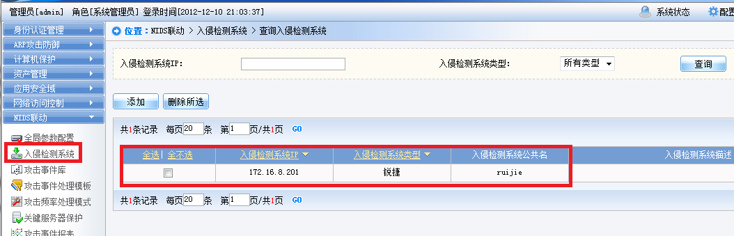 2. 确认已经在SMP中添加入侵检测系统,在SMP管理界面中,依次打开“NIDS联动”-“入侵检测系统”,需要注意的是,入侵检测系统的IP是IDS管理控制台的IP,而不是IDS硬件设备的IP,同时需保证入侵检测系统公共名和IDS控制台端配置的一致。