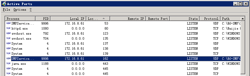 2. 如果服务没有启动成功,请使用aport.exe软件查看端口被哪个程序占用,关闭该程序后重启SMP服务。