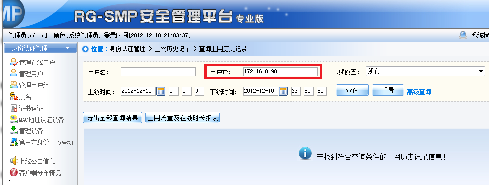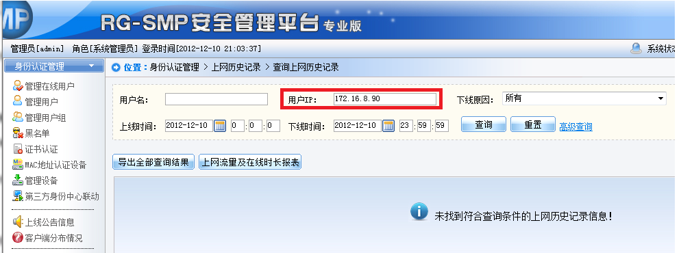 3. 在SMP的上网历史记录中通过该IP进行查找,如果无法找到该攻击源IP,说明使用此IP发起攻击的PC不是认证用户,所以SMP无法对其进行处理;