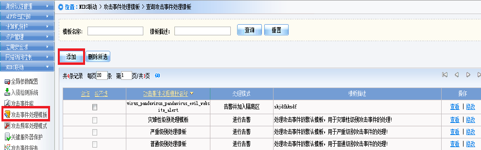 1)在SMP管理界面依次打开“NIDS联动”-“攻击事件处理模板”-点击“添加”,添加一个新的攻击事件处理模板。