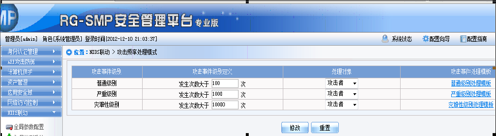1. SMP的攻击频率处理中,通过攻击次数来判别对攻击者采用何种攻击事件处理模板,只有攻击次数达到相应的攻击事件级别时,才会触发对应的攻击事件处理模板;