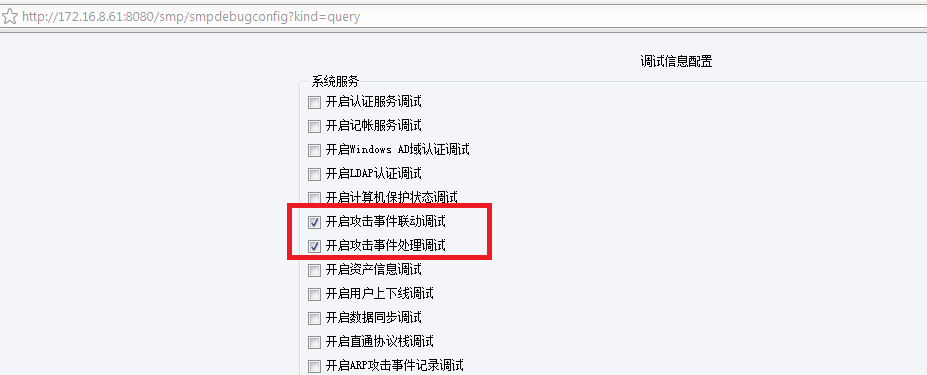 1). 请在浏览器输入:http://1.1.1.1:8080/smp/debugtool.jsp(将1.1.1.1替换为SMP真实IP),并勾选“开启攻击事件联动调试”和“开启攻击事件处理调试”开关后,点击最下方的“修改”按钮,开启debug调试开关。