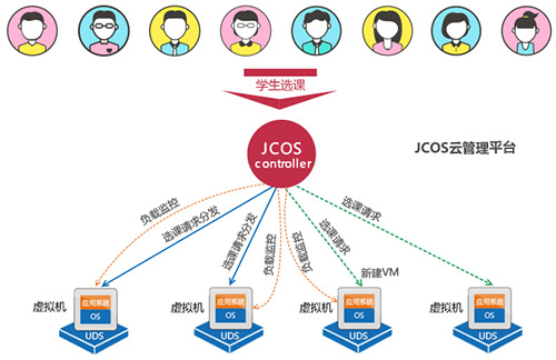 当学生开始选课时UDS会根据负载情况自动创建虚拟机,选课高峰过后UDS会自动将多余的虚拟机删除,整个过程无需人工干预。当然,此过程需要外置的负载均衡设备配合,以便在多个选课虚拟机服务器之间进行负载均衡。