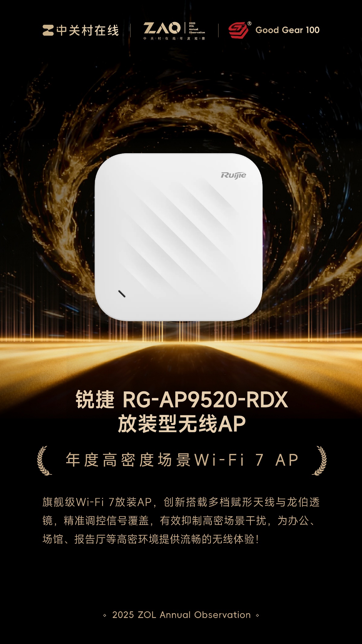 作为斩获GG100奖项的旗舰级Wi-Fi 7无线AP,锐捷RG-AP9520-RDX专为破解高密度、高并发场景的网络瓶颈而生。整机采用三射频架构与AI Radio智能射频卡,8条空间流带来高达6.453Gbps的接入速率,但真正的突破在于其在天线上的创新——多档赋形天线技术。