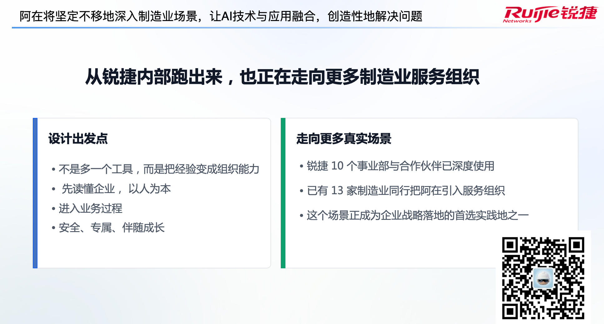全链路的深度赋能,使锐捷阿在真正实现了制造服务全周期的“更快、更准、更连续、更透明、更可复用”。面向未来,制造业智能化转型必将走向全生命周期与全链路的优化升级,锐捷阿在也将持续深耕工业场景,以AI技术助力制造企业筑牢产业核心竞争力。