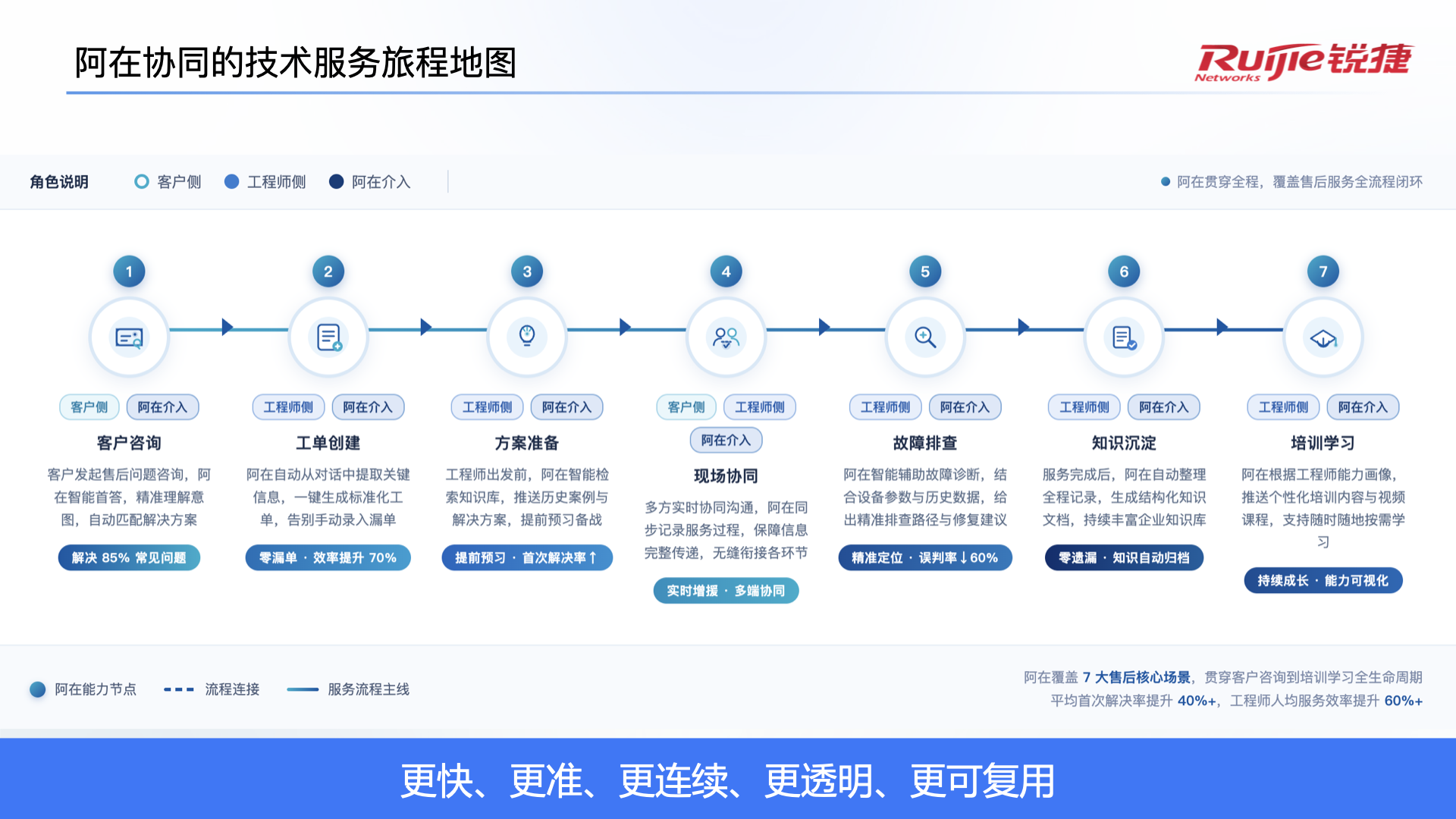 - 在锐捷内部实践中,阿在实现咨询拦截率从67%提升至97%,复杂问题处理效率提升7倍,在线会话量增长40%的同时,人工服务量下降25%;