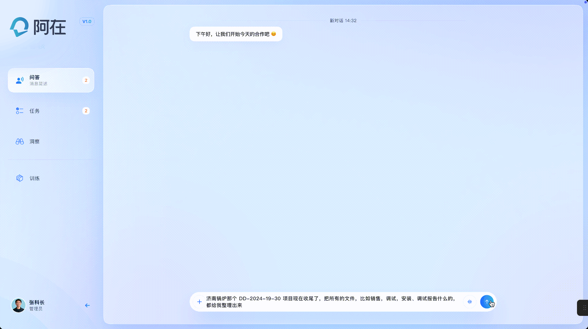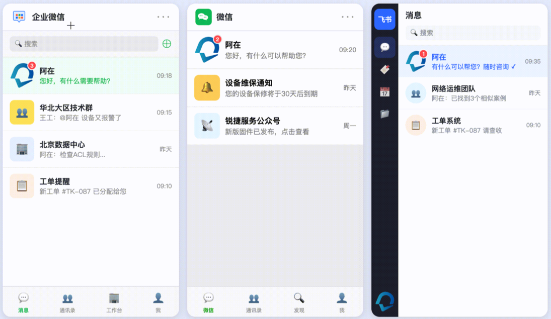 阿在可无缝对接飞书、企微、钉钉等现有系统,实现“开箱入职”,始终践行“好的企业服务,不是把客户拉到你这里,而是走进他的工作现场”的理念。