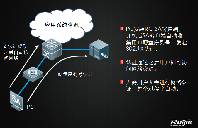 2、用户PC开机之后,RG-SA客户端将自动运行,收集用户的硬盘序列号信息,将硬盘序列号信息作为认证的校验因素自动发起802.1X认证。