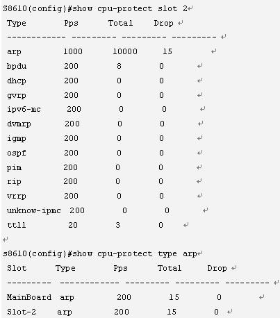 实时显示当前CPU处理各类报文统计值,包括交换机收到的各类报文的累加值和速率,以及被丢弃的报文数,通过这些数据,可以使用户及时了解网络中当前的或者一段时间内的各类报文的流量情况,并可以以此为依据,实施CPP设置。而且对于S86设备,除了支持基于报文类型的流量统计外,还支持基于管理板和所有线卡的流量的分别显示,使报文数据能细化到每一块线卡。