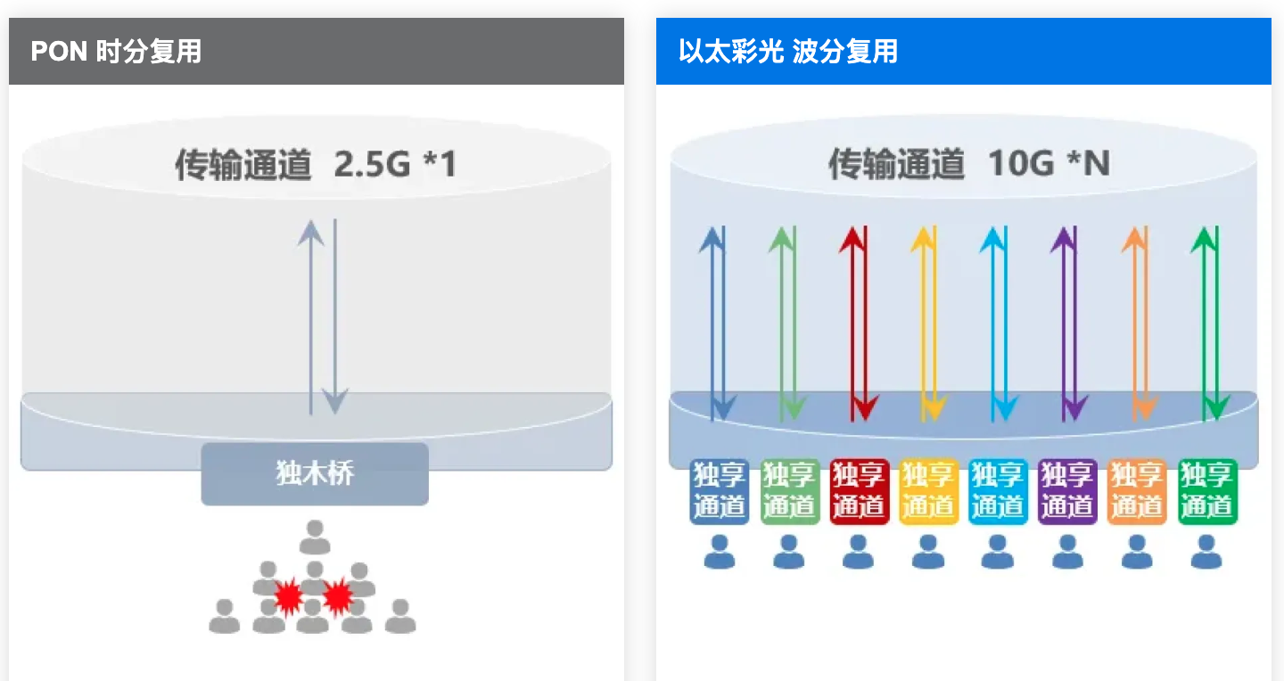 而以太彩光同样以光纤作为传输介质,不过协议依托以太网,通过波分复用(WDM)技术进行合分波,使得不同光信号能在一根主干光纤上传输,为点到点独享模式,光通路层面不分光,传输效率提升了16倍。核心机房部署超聚合交换机,下联无源彩光设备,通过光纤入室将全光接入交换机部署在每个房间里,实现了汇聚节点彻底无源,弱电间0维护,同样为2层架构。