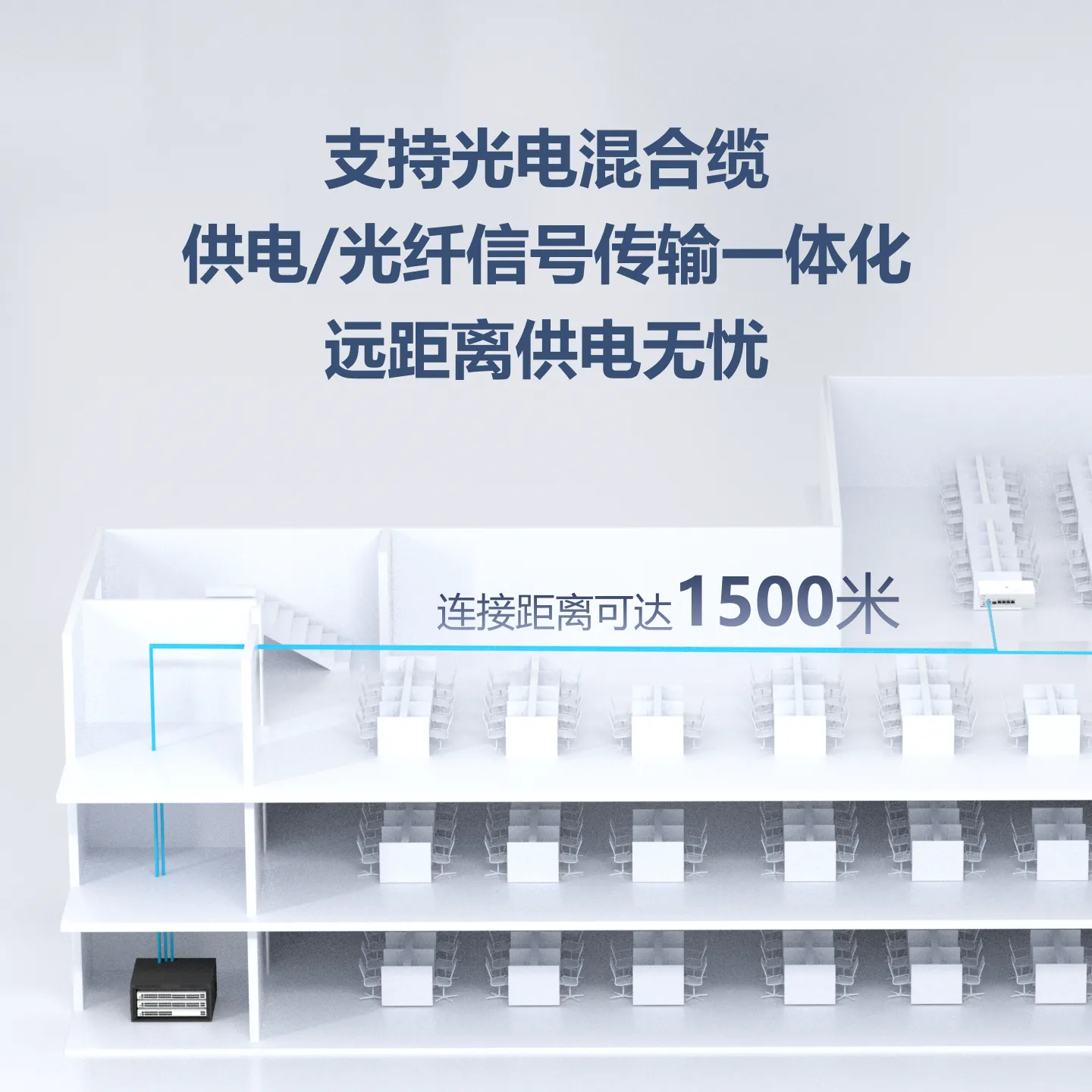 第一种:如果您的企业对于管理性要求非常高,那可以使用光供电主机,通过彩光连接到光供电主机,光供电主机再通过光混去连接末端的 AP 交换机。