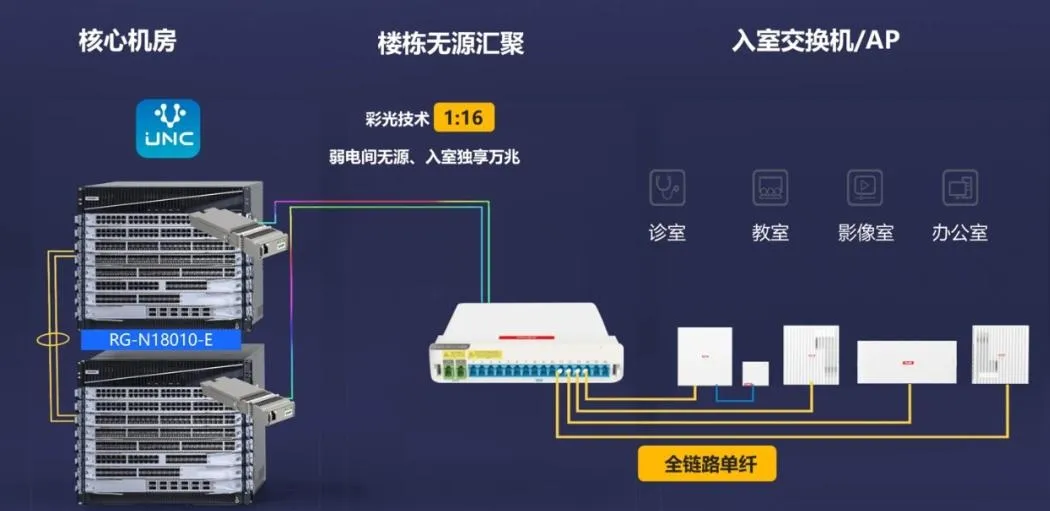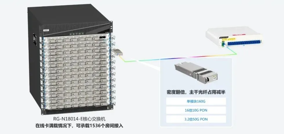 以锐捷RG-N18014-E核心交换机为例,在线卡满载的情况下,一个设备就可以承载1536个房间的接入(设备有96个端口,每个端口16个接入,96×16=1536),足以满足绝大部分学校、医院、企业的需求。