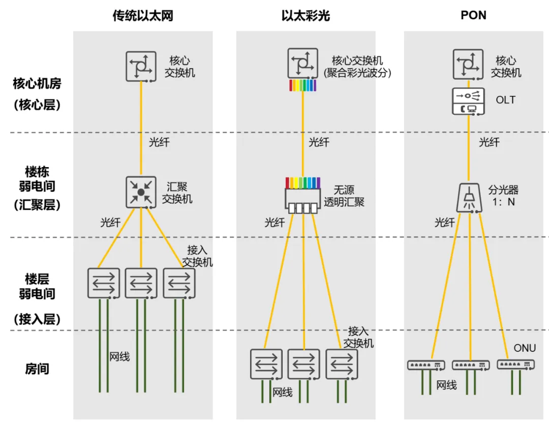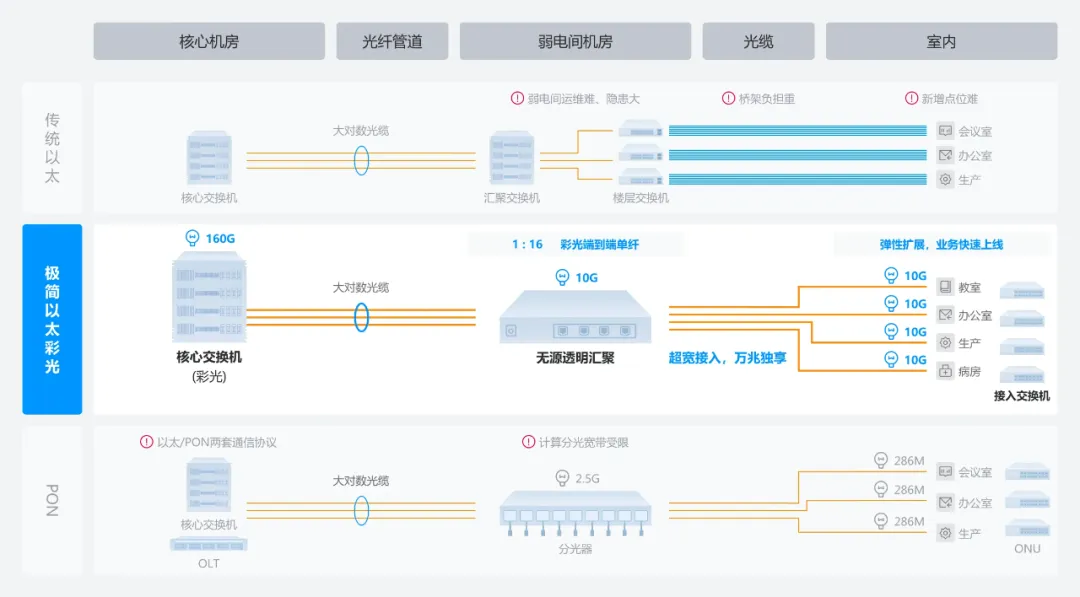 以太彩光方案中,每个接入交换机分配一个独立的、专属的波长,接入交换机到汇聚交换机是独享带宽,不存在争抢,而且时延也更低。在维护性、扩展性、兼容性等各方面,以太彩光方案也比传统以太网方案和PON方案更有优势。