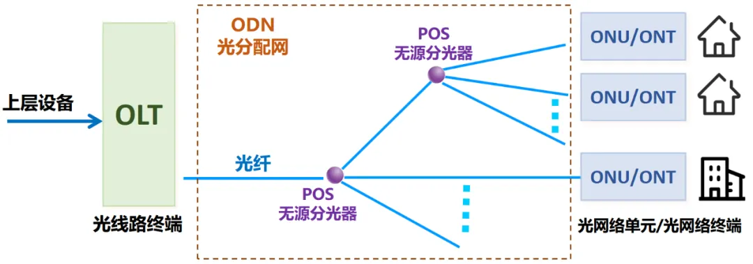PON方案采用点对多点(P2MP)架构,说白了,就是把一束光复制为多束光,连接多个用户(如32/64/128个)。