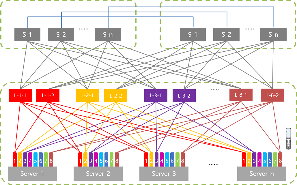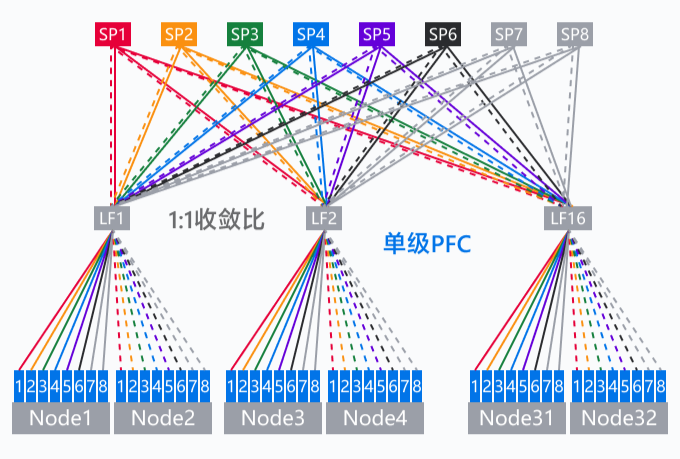 - 支持多轨组网架构,三级组网最大能连100000+GPU集群。