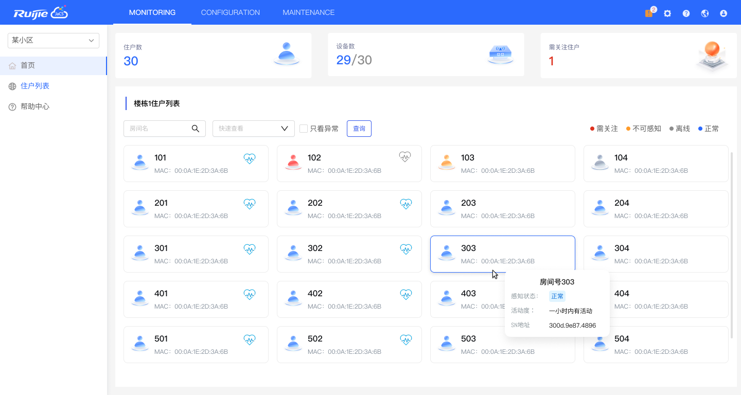 基于Wi-Fi CSI感知技术,锐捷与与日本一家领先的ISP(互联网服务提供商)客户共同开发了独居老人看护解决方案,部署在老人公寓的锐捷AP,其感知模块仅向云端输出“活动”、“无人”、“离线”等结构化结果,不涉及隐私数据,确保了方案的合规性,同时,公寓管理者可以通过简洁的WEB前端实时查看每个房间的活动状态。