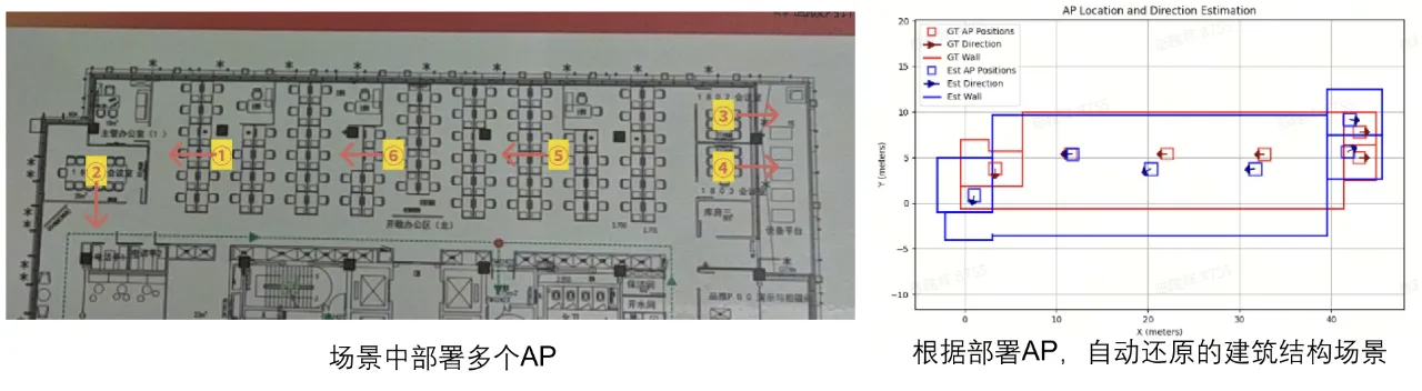 现场部署多个锐捷AP后,即使在没有建筑图纸的情况下,系统也能够利用CSI、FTM定位等多种无线感知数据,通过AI算法自动反演出当前环境的建筑结构、墙体布局和空间拓扑,即“户型重构”,就像给房子做 "Wi-Fi CT扫描" ,让AP自己"摸"出房间长什么样。在完成环境重构后,它可以为“AI孪生网络”提供精准的数字底座,结合仿真平台与智能算法,实现网络规划与优化效果,让网络部署和运维变得智能和高效。