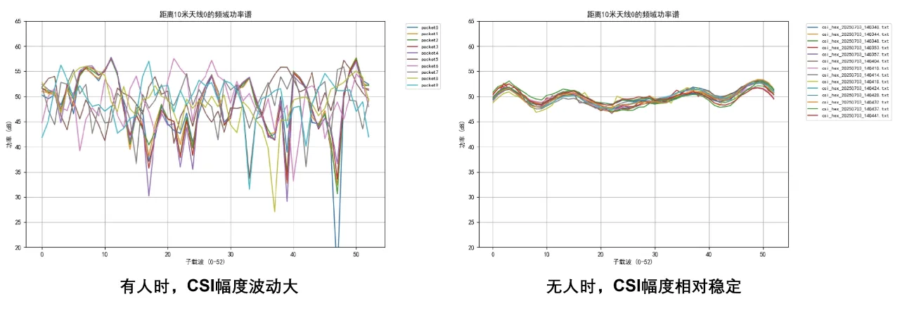 有人时: CSI幅度出现剧烈且无规律的波动,显著区别于静止状态;